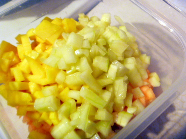 Next, dice up your mango, cucumber (seeded), and nectarines.  Place in the bowl.
