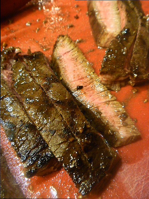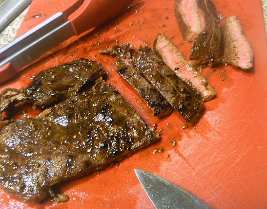 Remove steak from the marinade. Discard the marinade. Add the steak to the grill and cook about 4 minutes on each side until desired doneness. Remove steak to a cutting board and allow to stand for 5 minutes before cutting. Slice steak diagonally across the grain into thin strips.  Serve.