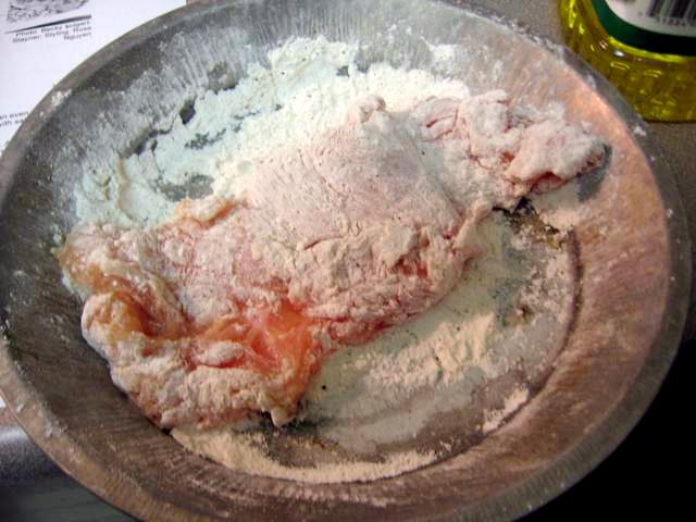 Salt and pepper your chicken. Then put some flour in a pan and dredge your chicken breasts on both sides in the flour.