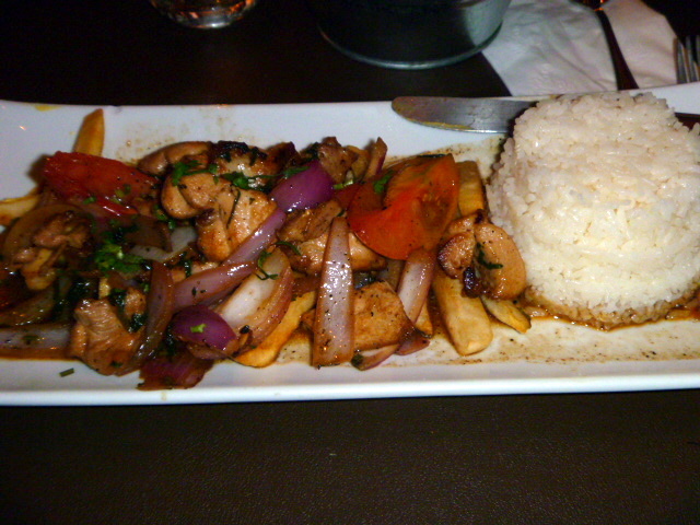 I had the Pollo Saltado, a dish of chicken, onion, tomatoes, and french fries in a spicy soy based sauce.