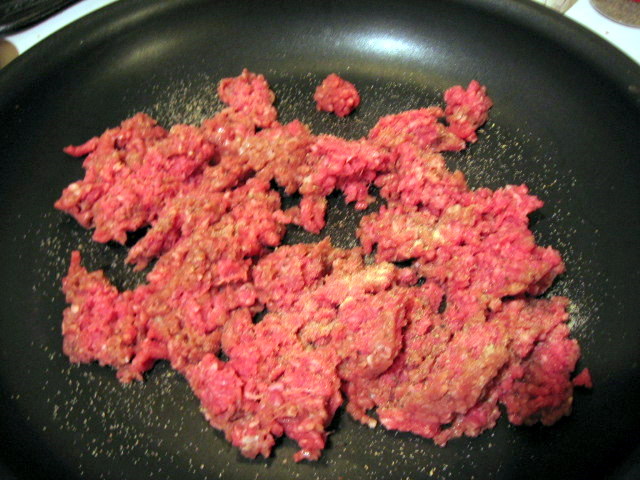 Brown the ground sirloin in a skillet, breaking meat in to chunky bites. Sprinkle with 2 tsp of garlic powder. You want the meat to taste garlicky.