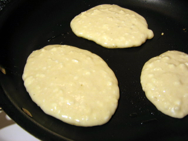 Heat oil in a skillet (over medium heat) and pour batter, about 1/4 cup each, and cook until pancakes bubble. (you can see the cottage curds...)