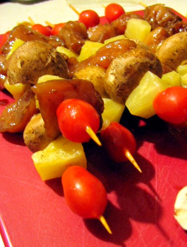 Pull chicken out and discard the marinade. Thread the chicken, mushrooms, cherry tomatoes, and pineapple onto the skewers. Note: if using wooden skewers make sure to soak them for about 30 min so they will not burn while grilling.