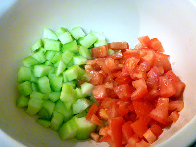 tomatoes. Peel and cube cucumber. Place tomatoes and cucumbers in a medium bowl.