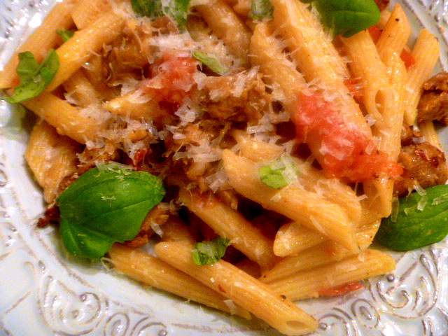 The sausage gives it some hearty texture and the pecorino lends a nutty flavor. The sauce is made from light fresh tomatoes...quick and easy. Great for an easy lunch or a light dinner.