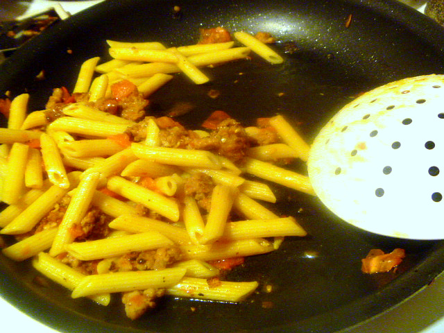 The technique is simple. Boil the pasta in one pot and in a skillet cook the sausage and onions. Make the sauce by adding the garlic and tomatoes, allowing to cook to release the juices.