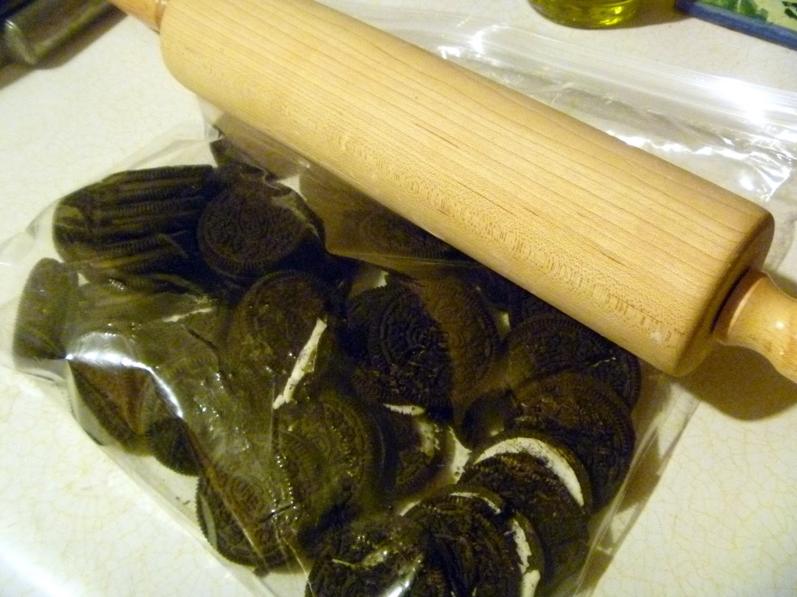 Preheat oven to 325 degrees. In a medium bowl, combine the crushed cookies