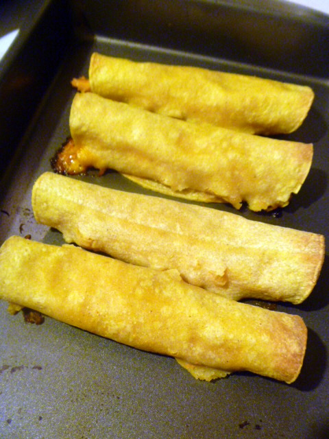 Baking doesn't give you that extra fat (that we all don't need) that frying does. But, you still end up with some tasty, crispy taquitos!