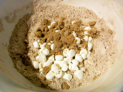 Add your brown sugar and marshmallow tidbits. Toss to coat the marshmallow in the flour mixture. This will help them stay afloat in the muffins and not fall to the bottom.