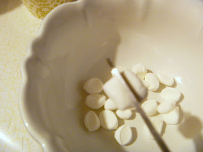 First you want to take your mini marshmallow and cut them in half, making tidbits. Place these in a small bowl and set aside.