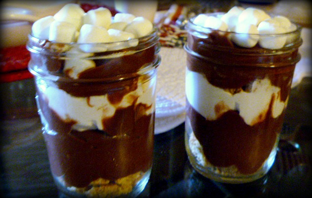 My s'mores consist of crumbled Soft Paws (Teddy Grahams) for the graham cracker flavor, Chocolate Fudge pudding (instead of a chocolate bar), and marshmallow fluff (for the roasted marshmallows). All layered in a cute little mason jar!