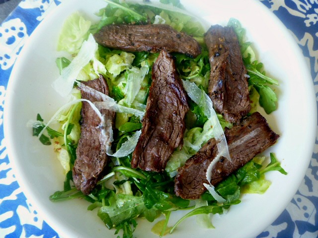 This Balsamic Flank Steak Salad with Parmesan makes a wonderful salad for lunch or dinner. I marinated the steak in the morning and then took it out to grill on my indoor grill pan. Lunch turned out perfect with the most flavorful and yet tender steak, sitting on top of crisp lettuce slightly dressed with a simple olive oil and lemon mixture. To give it a pop I shaved long Parmesan strips over the top for a little saltiness. The result was a perfect, light, and very tasty salad.