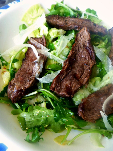 Slice steak diagonally across the grain into thin strips. Arrange steak strips evenly over salad. Sprinkle shaved Parmesan across the salad and serve.