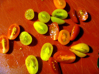 Take a pint of your cherry tomatoes and cut them in half. Add to the bowl.