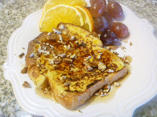 I still remember this dish and today I decided to re-create this for our breakfast.  I added the addition of chopped pecan which I think lent a wonderful crunch to the dish.  Oh my! Thick bread slices with a touch of grated orange peel and crunchy pecans make this French toast something special!
