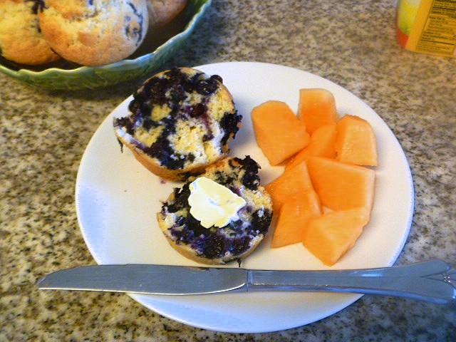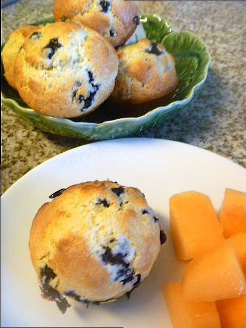 On the way we always stop for a nice breakfast at one of our favorites places in Summerland.  The food is always on spot. This time we opted to a continental breakfast that came with a basket of bakery items.  I spotted a large 'bakery' style muffin and I knew I would be in heaven.  Bursting with blueberries and a hint of citrus.   Yep, I was right....Heaven!