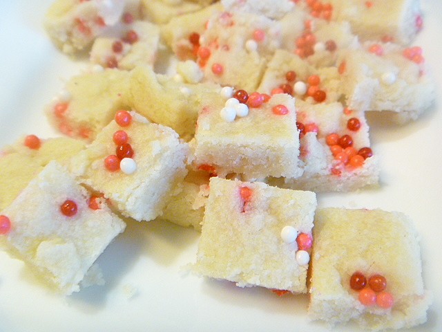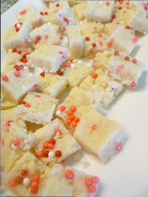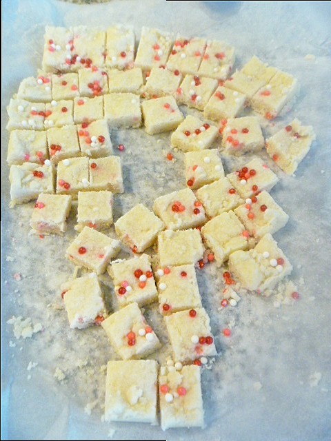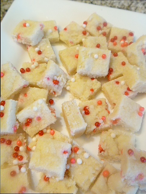I've always loved shortbread and saw a post on Pinterest of some shortbread cut into little "bites".  I immediately thought Valentine's Days with pretty colored sprinkles.  Those would be so cute...and they are!