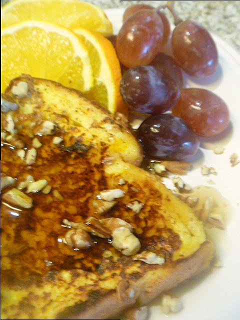 The last time we went I indulged and got an order of french toast, fruit, and bacon. Yum!  It was wonderful and the whole time I was eating it I couldn't quite make out the ingredient that made this french toast just a little more special.  One the way home it hit me!  The flavor of citrus, specifically oranges lingered in the dish.