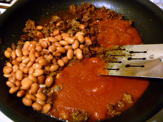 Next, add a can of rinsed and drained pinto beans, tomato sauce, water, and salsa.