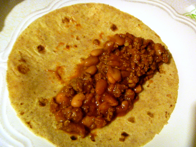 To assemble take your heated tortilla and place some filling down the middle toward one side of the tortilla.